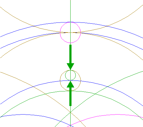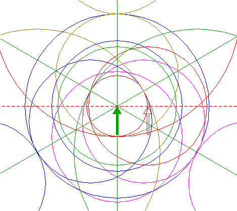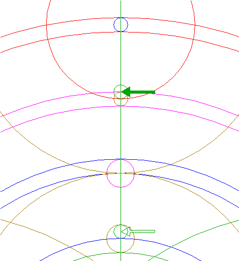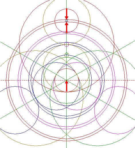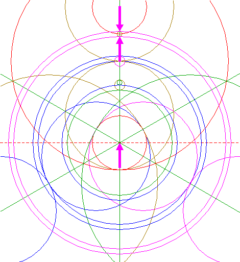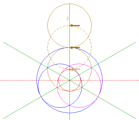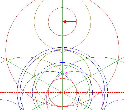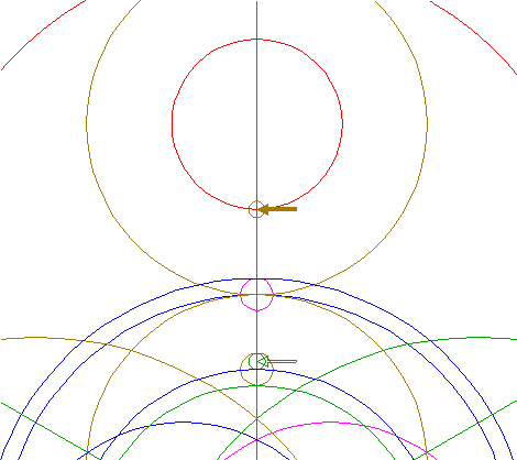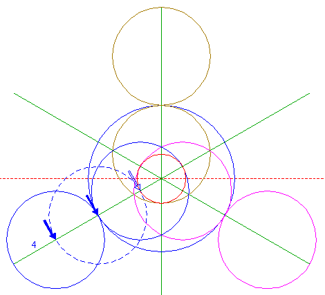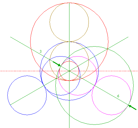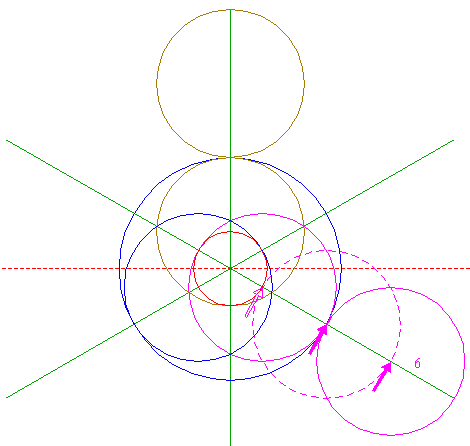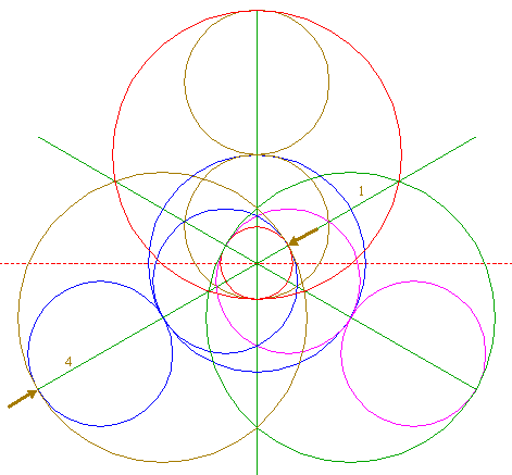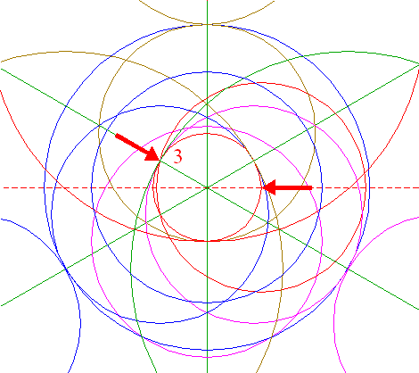 | Copy circle 4 to its intersection with ray 8 nr. 2. Move this circle (copy and delete original) to its own corresponding intersection. |