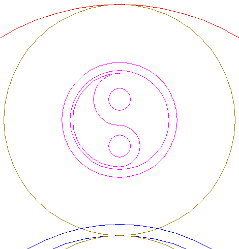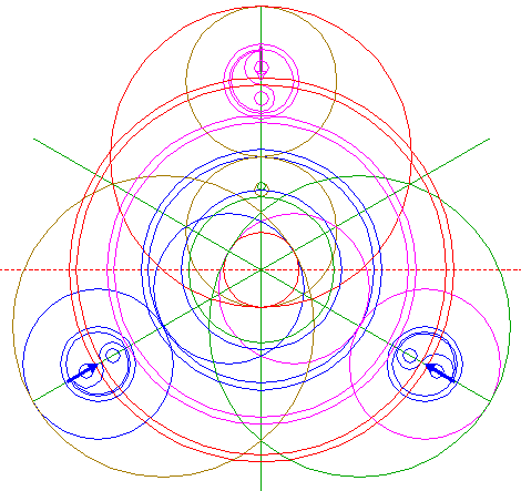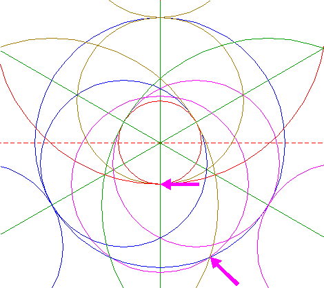 | Construct a circle centered at the lower intersection of circle 7 and the vertical centerline, passing through the lower intersection of circles 1 and 14. |