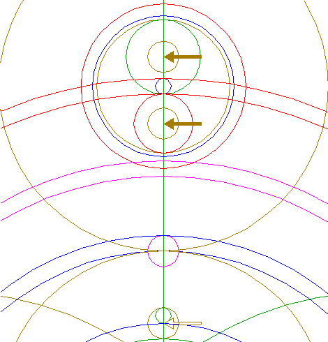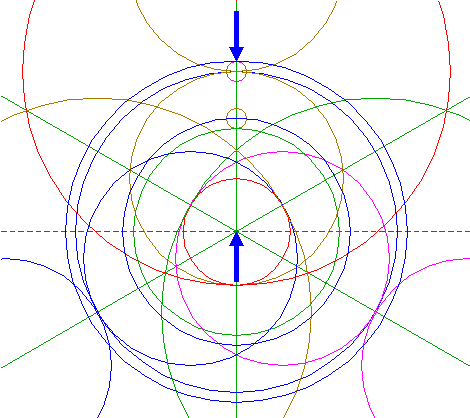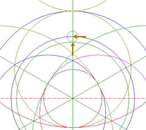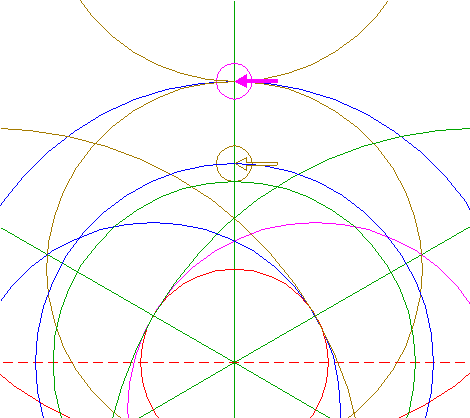 | Construct a "two-points" circle between the upper intersections of circles 16 and 19 with the vertical centerline. |