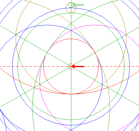 | Construct a "two-points" circle (defined by the end-points of a centerline) between the intersection of circle 4 and ray 8 nr. 5, and the upper intersection of circle 9 and ray 8 nr. 2. |
