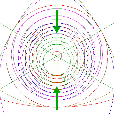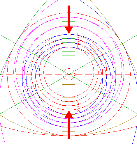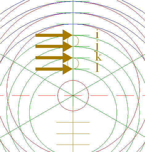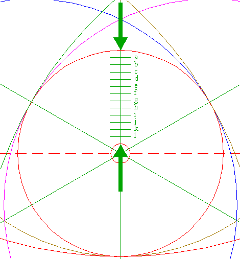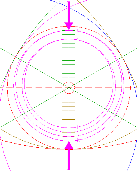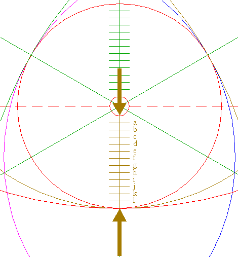 | Draw the connecting line between the upper intersections of circles 7 and 37 with the vertical centerline, and divide this line into thirteen equal parts. Number the division-points from top to bottom a through l. |