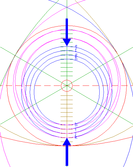 | Draw the connecting line between the lower intersections of circles 7 and 37 with the vertical centerline, and divide this line into thirteen equal parts. Number the division-points from top to bottom a through l. |