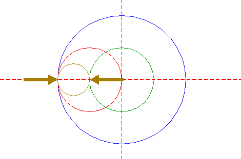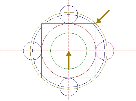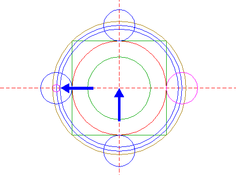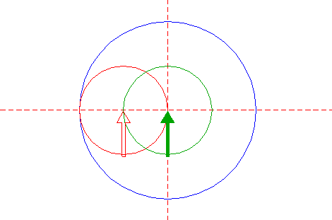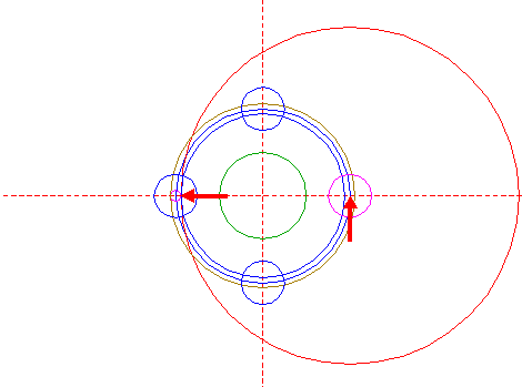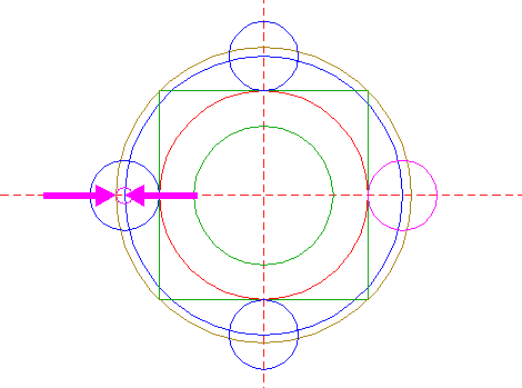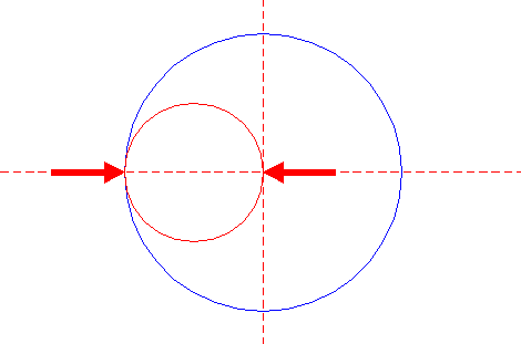| Construct a "two-points" circle (defined by the end-points of a centerline) between the center of circle 1 and its lefthand intersection with the horizontal centerline. |