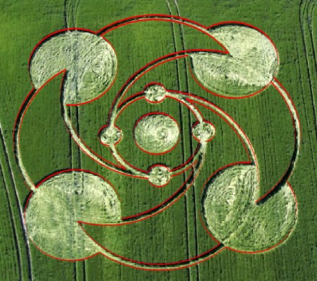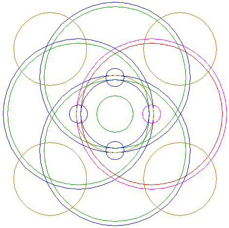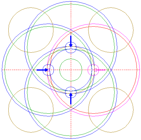 | Copy circle 1 four times, to the outer mutual intersections of circles 12 and 13. |