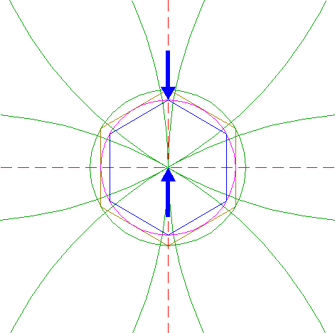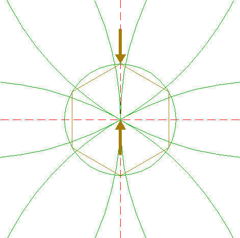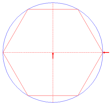 | Construct a "two-points" circle between the intersections of the righthand sides of hexagons 9 and 11 with the horizontal centerline.