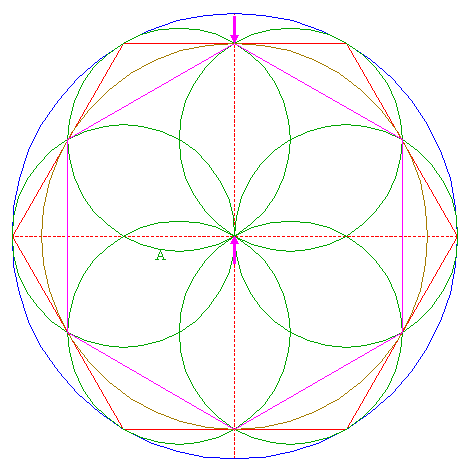 | Construct the inscribed hexagon of circle 4, pointing up.