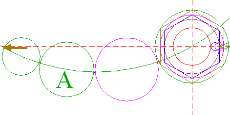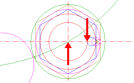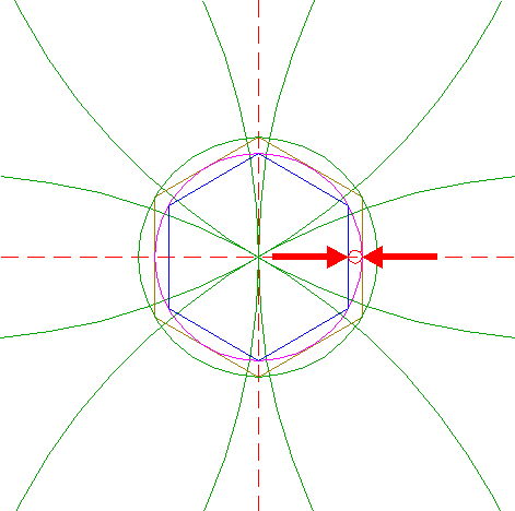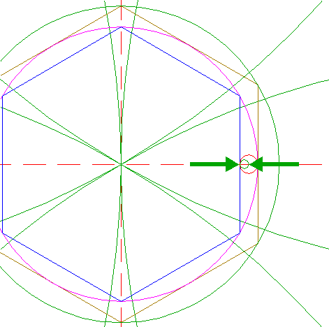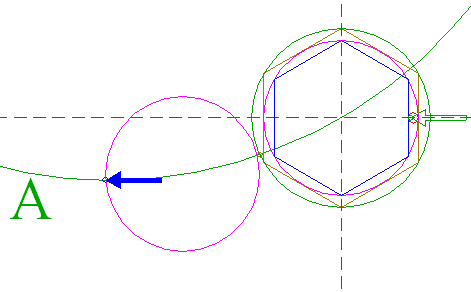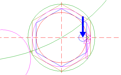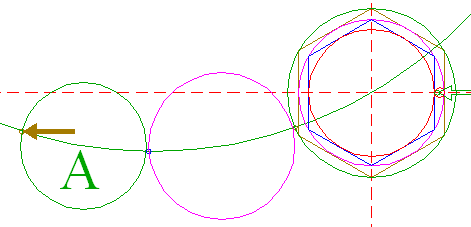 | Construct six "two-points" circles (a "two-points" circle is defined by the end-points of a centerline) between the center of circle 1 and the six angular points of hexagon 2. Find the upper lefthand circle, and call it circle 3A.