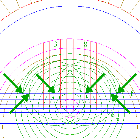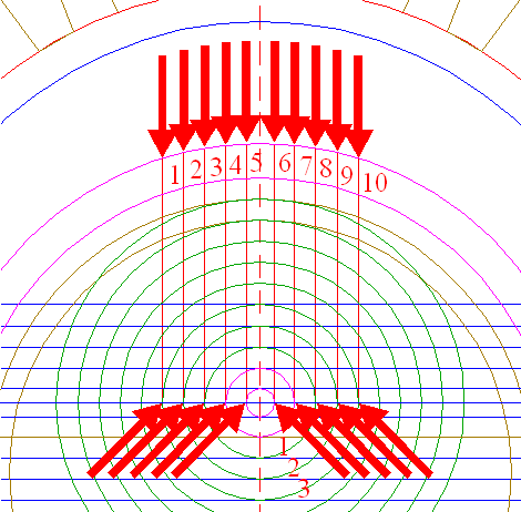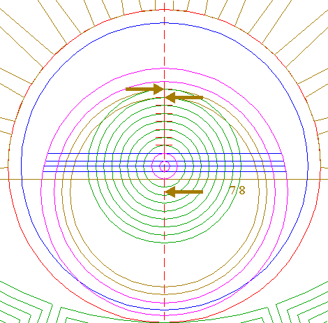 | Draw the connecting line between the upper intersections of circles 42 and 80 with the vertical centerline. Divide this line into seventeen equal parts. Construct sixteen circles concentric to circle 40, passing through the divisions of this line. Number (the spaces between) these circles 1 through 16 from inside outwards. See detail. |