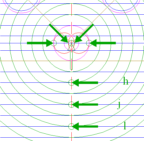 | Construct nineteen "two-points" circles, the first between the intersections of circles 81 nrs. 3 and 4 (space 3) and ray 88 nr. 1. See detail. Repeat this for the combinations of ray 88 nr. 2 and space nr. 5, 3-7, 4-9, 5-11, 6-14, 7-8, 7-14, 7-16, 8-8, 8-14, 8-16, 9-14, 10-7, 10-11, 11-9, 12-5, 13-5 and 14-3. |