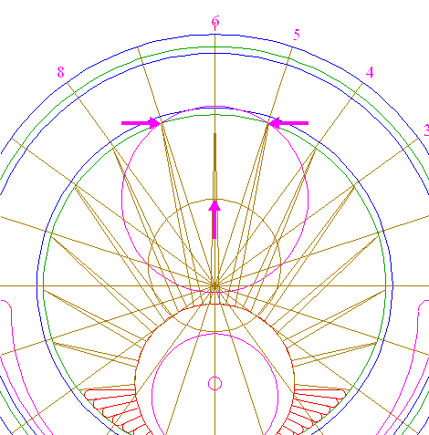 | Draw two lines, from the center of circle 40, to the intersections of inner circle 50 with rays 4 nrs. 15 and 17, and extend these lines downto circle 8. |