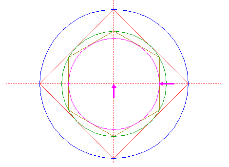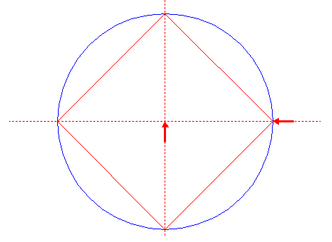 | Construct a "two-points" circle (defined by the end-points of a centerline) between the righthand intersections of circles 1 and 3 with the horizontal centerline.