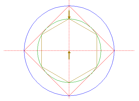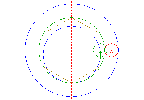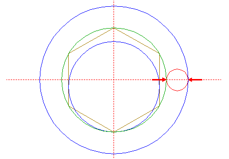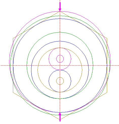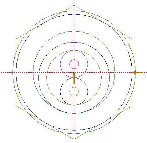 | Construct a "two-points" circle between the lower intersection of circle 1 with the vertical centerline and the top angular point of hexagon 19.