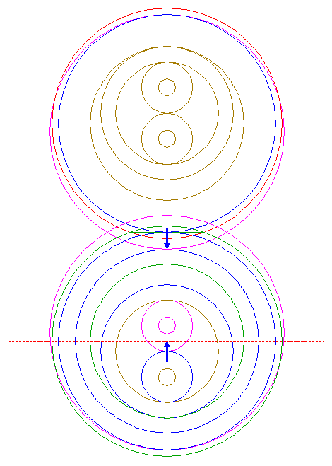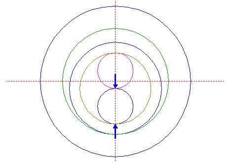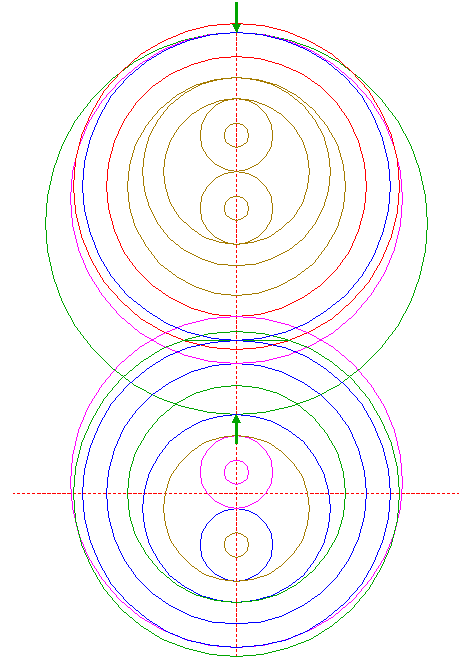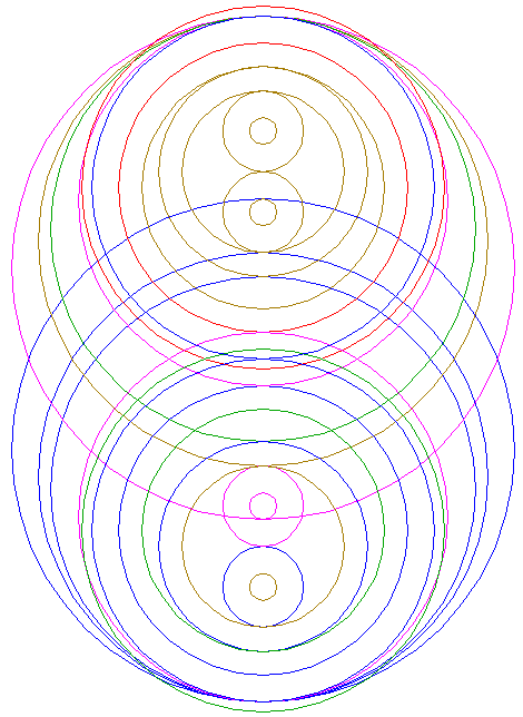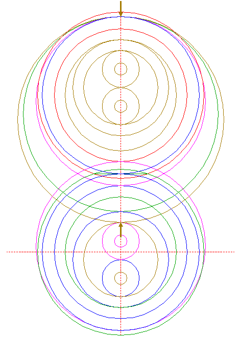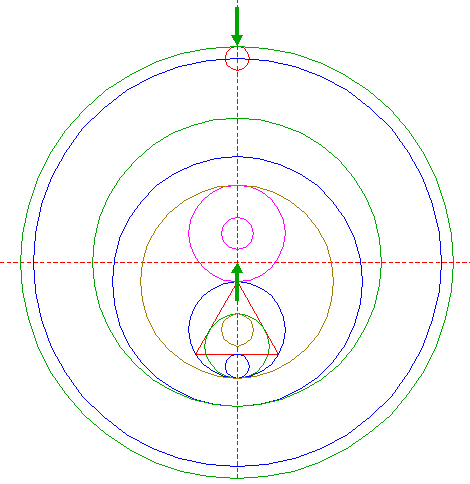 | Construct a "two-points" circle between the lower intersection of circle 15 and the upper intersection of circle 21, both with the vertical centerline.