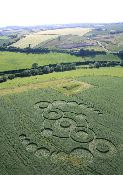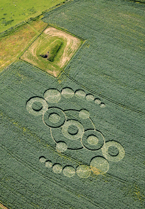 We talk about how amazing crop formations are throughout the season, well this location at Stony Littleton Long Barrow is quite stunning. The whole atmosphere on top of the hillside next to the ancient burial chamber has to be experienced. What is quite amazing also is this formation is in young beans of Flax? Its quite unusual, and I am at a loss to indentify it. I have never experienced a formation in this type of crop before, and thought at first glance it was old Canola. The crop is only three feet high, however it does have a yellow flower. Overall the floor construction is extremely neat, with some breakage. The plants are quite well flattened and will not recover. Design has a creature element. More to follow.