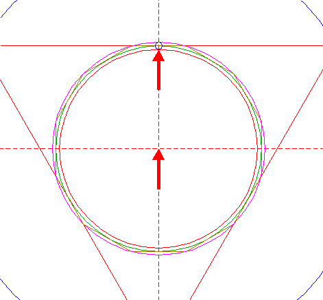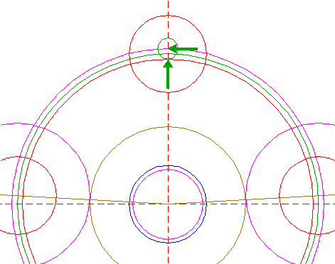 | Construct a "two-points" circle (defined by the two end-points of a centerline) between the center of circle 15 and its upper intersection with the vertical centerline. |