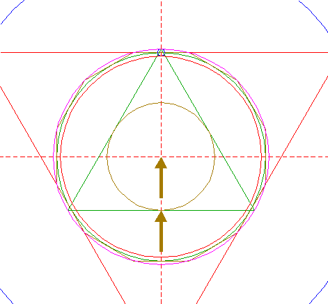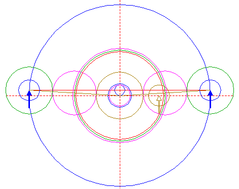 | Construct a circle centered at the lower intersection of circle 34 and the vertical centerline, tangent to circle 15 at the lower side. |
