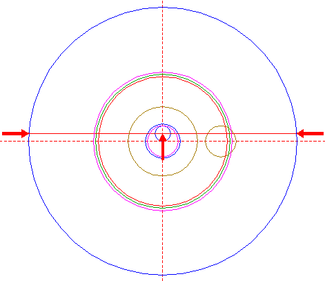 | Construct a circle centered at the upper intersection of circle 28 and the vertical centerline, tangent to circle 9 at the upper side. |