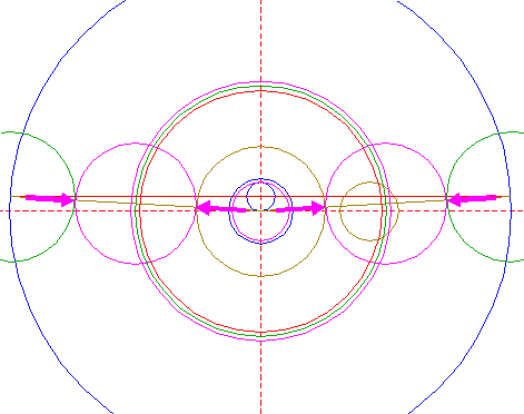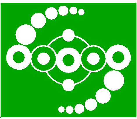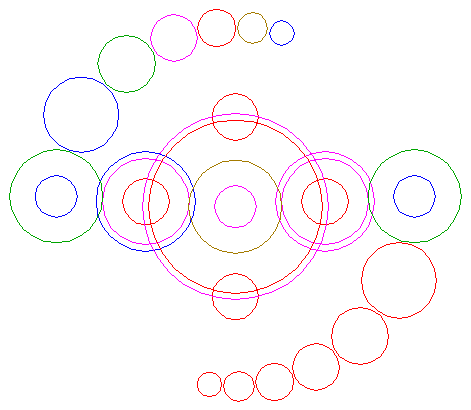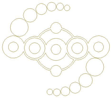 | Copy circles 41, 43, 45, 47, 49 and 51 as a whole, while rotating about the center of circle 1, from the center of the lefthand circle 18 to the center of the righthand circle 18, as shown. |