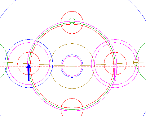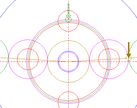 | Copy circle 11 four times, to the intersections of circle 3 with lines 19 and with the vertical centerline. |