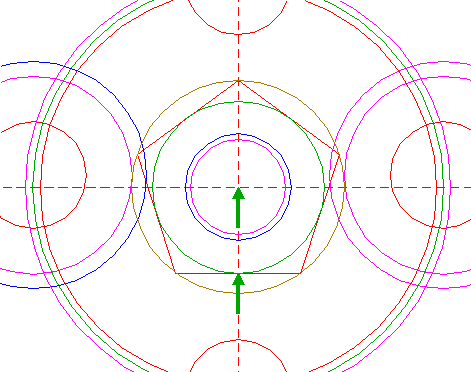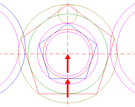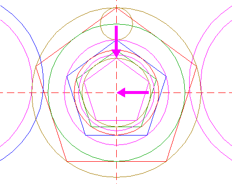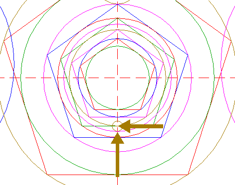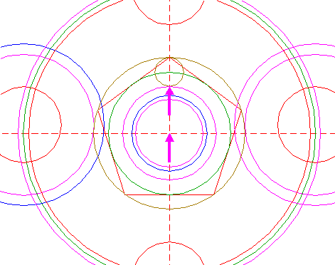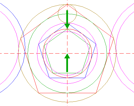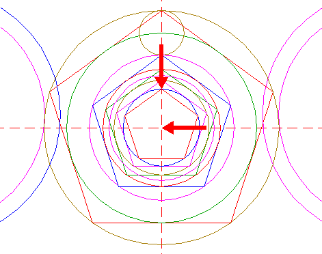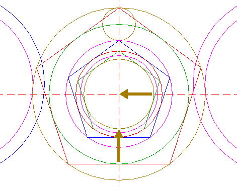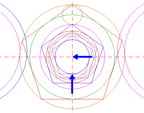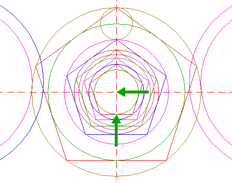 | Steps 27 and 28 will be repeated iteratively four times, starting with circle 30. (For clarity, circle 11 is left out from here on). Inscribed pentagon. |