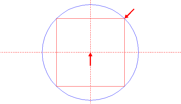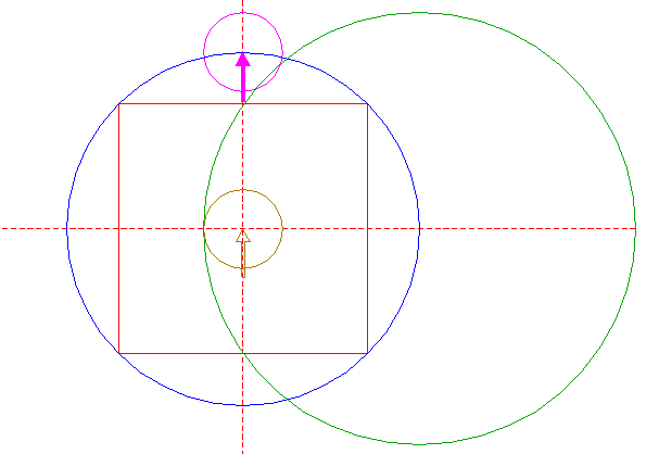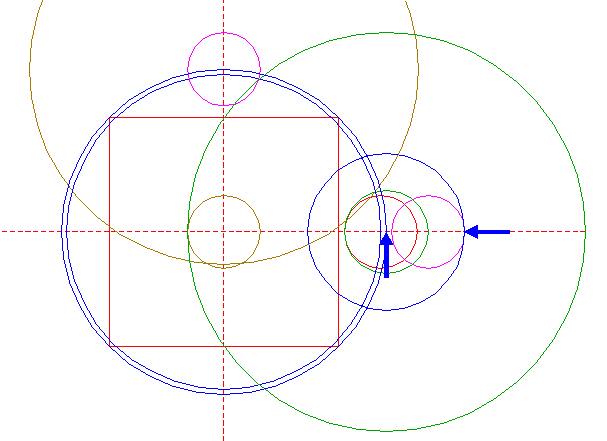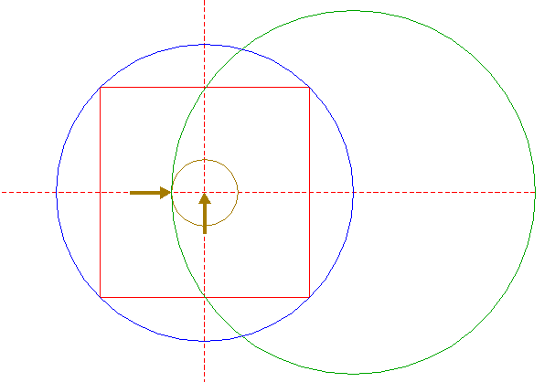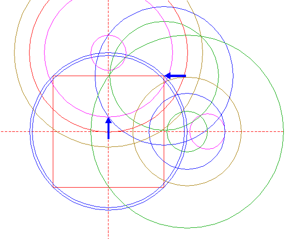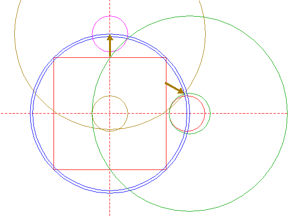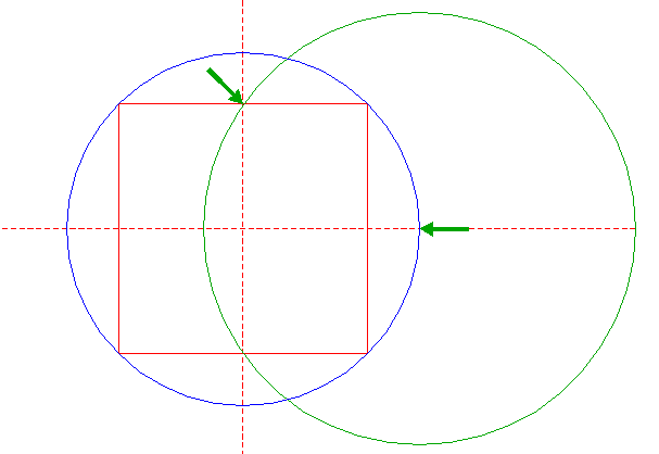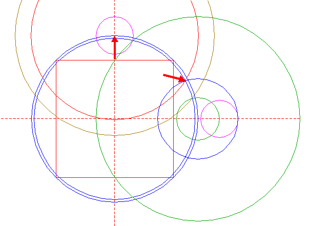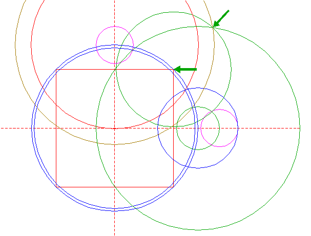 | Construct the inscribed square of circle 1, sides horizontal and vertical. | ||