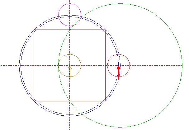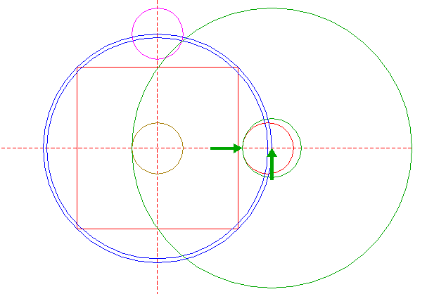 | Construct a circle centered at the righthand intersection of circle 1 and the horizontal centerline, passing through the intersection of the upper side of square 2 and the vertical centerline. | ||