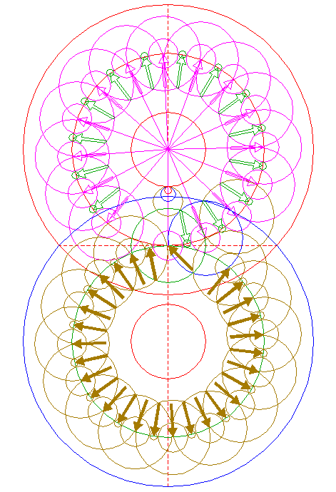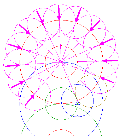 | Copy circle 14 fifteen times, to the intersections of rays 5 and circle 2. |