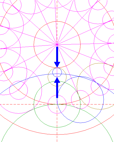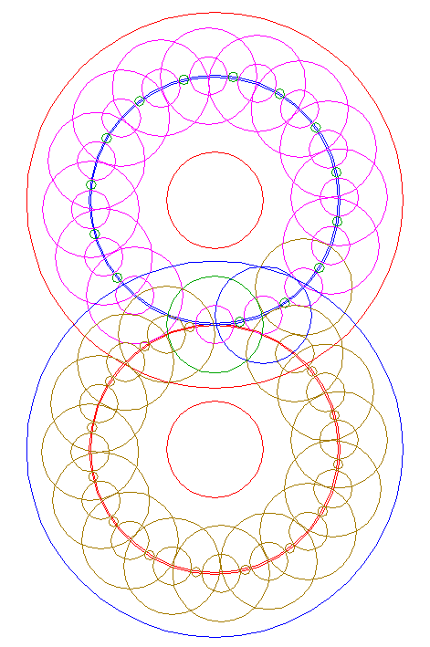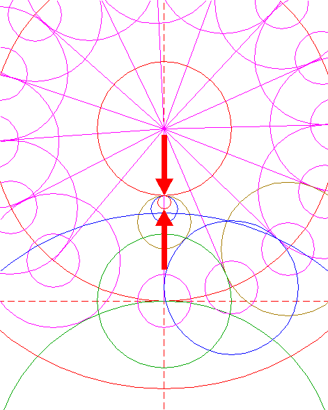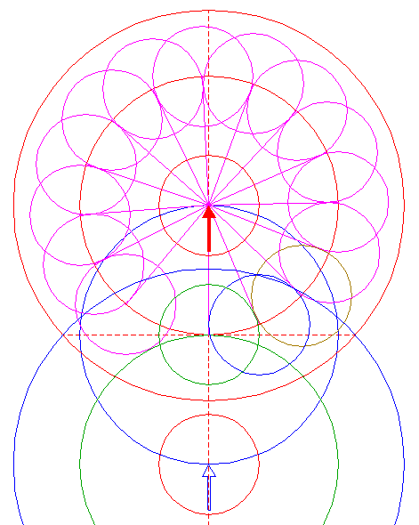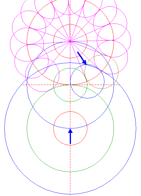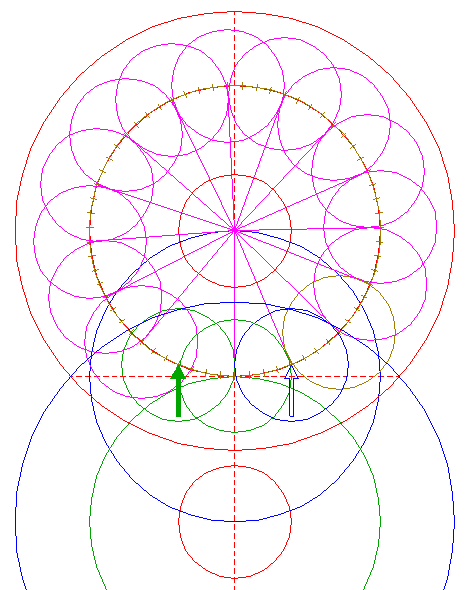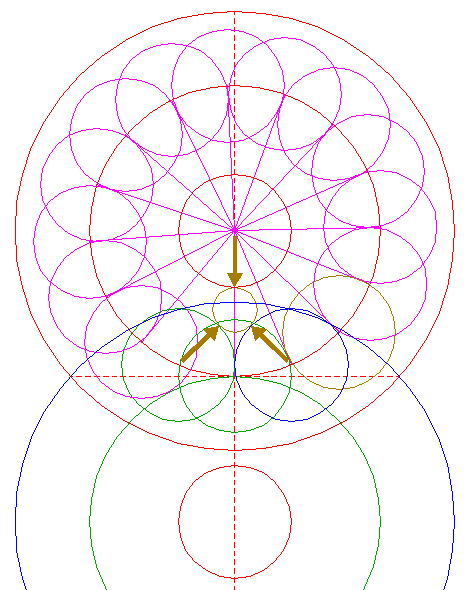 | Construct a (small) circle centered at the righthand intersection of lowermost circle 15 and circle 2, passing through the lefthand intersection of lowermost circle 18 and circle 2. |
