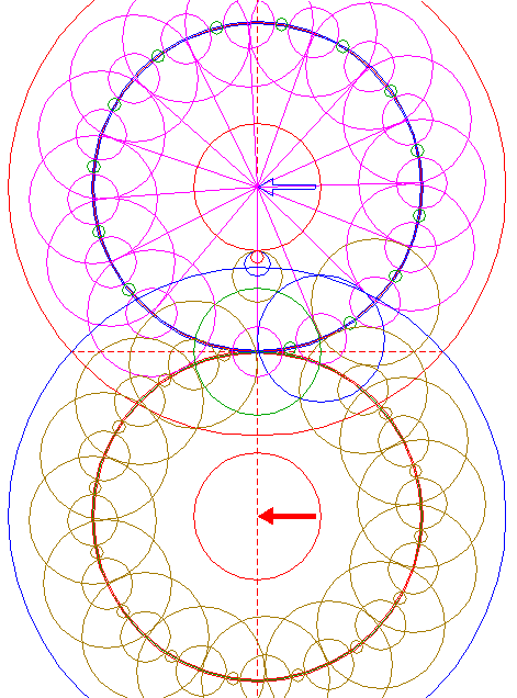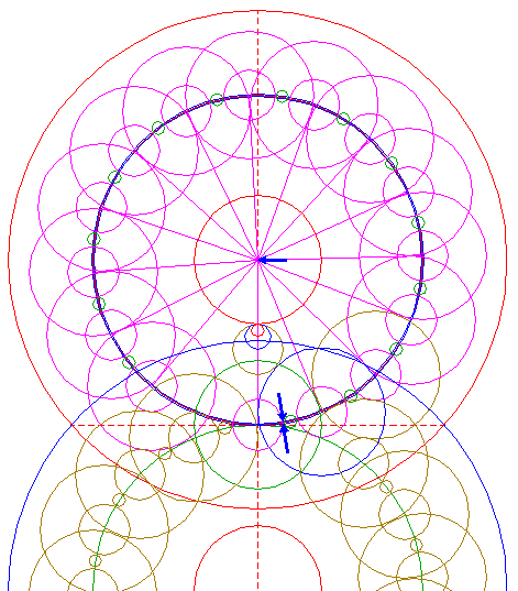 | Construct the inscribed regular 63-sided polygon of circle 2, pointing down. (For clarity, the angular points are marked). |