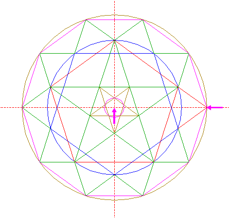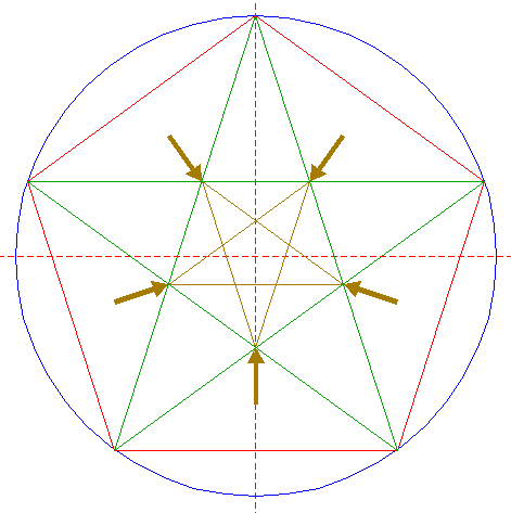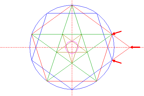 | Construct the inscribed pentagram of circle 1, by drawing the diagonals of pentagon 6. |