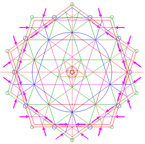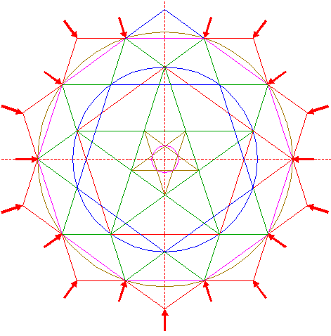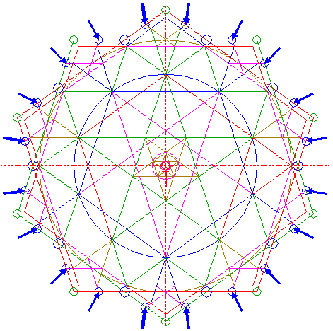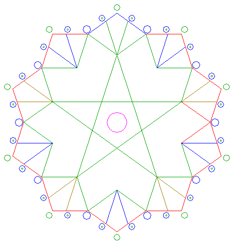 | Copy circle 22 ten times, to the angular points of pentagons 17 and 18. |
