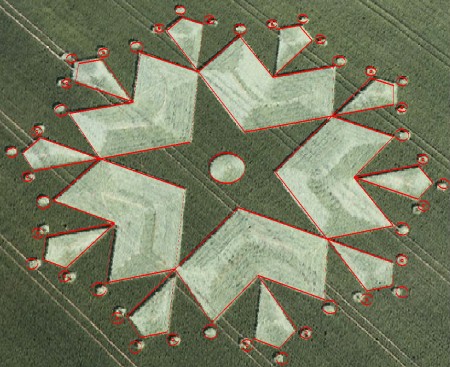 | Copy circle 22 twenty times, to the end-points of (extended) lines 24 and 25, as shown. |
