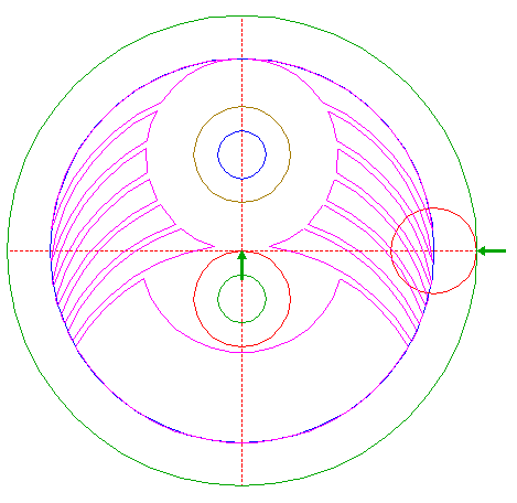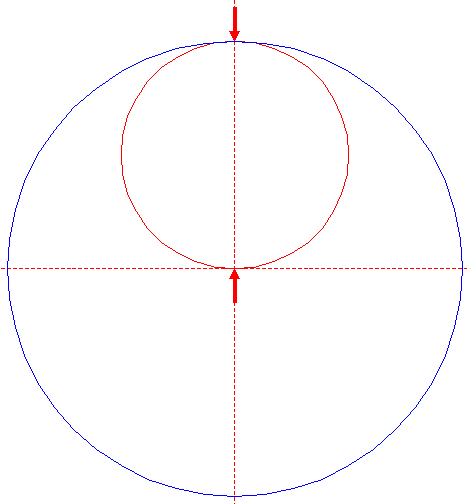| Construct a "two-points" circle (defined by the end-points of a centerline) between the center of circle 1 and its upper intersection with the vertical centerline. |