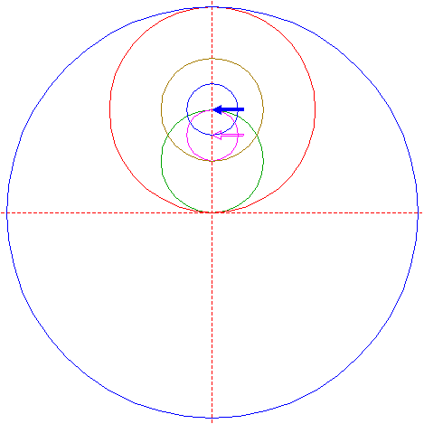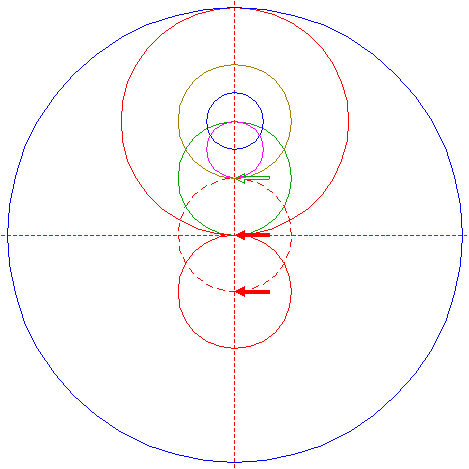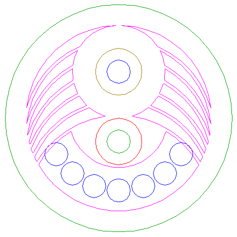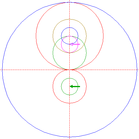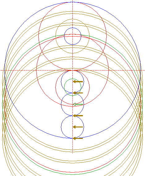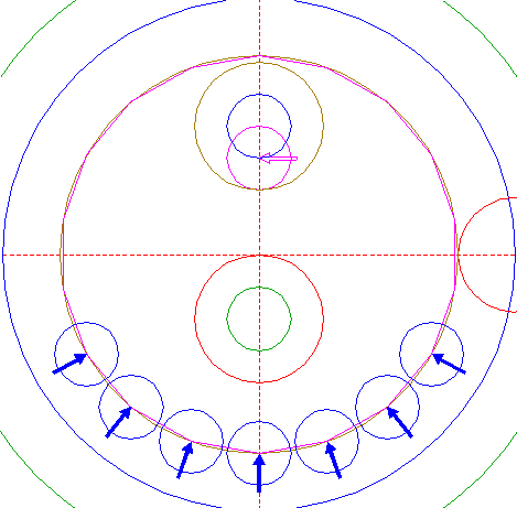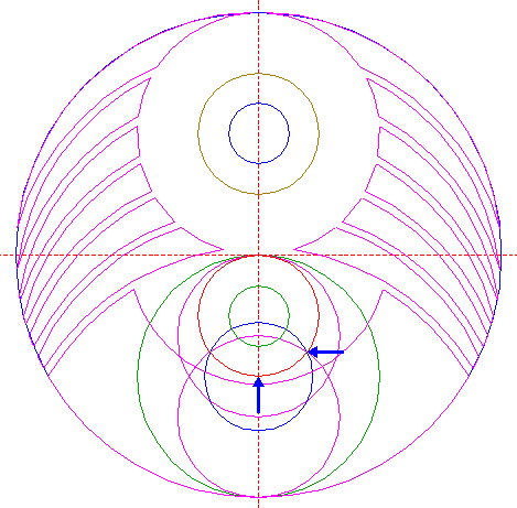 | Copy circles 17 and 18 as a whole five times, to the (other) centers of circles 16 and their lower intersections with the vertical centerline. |