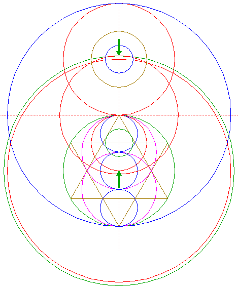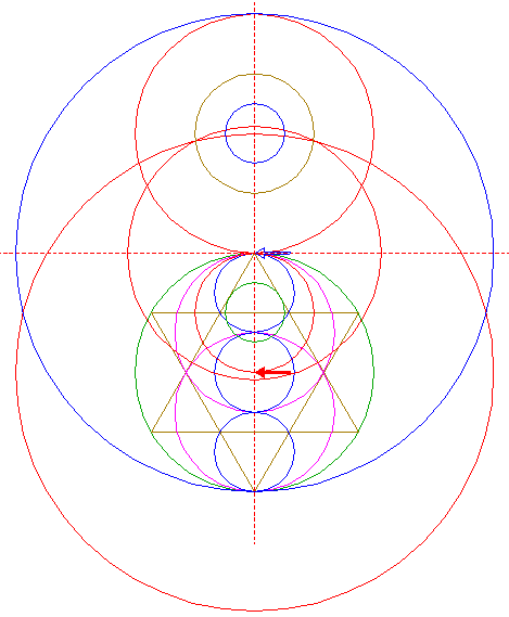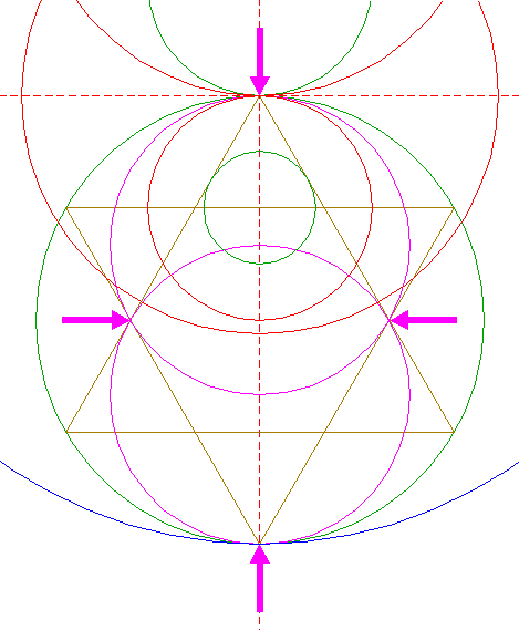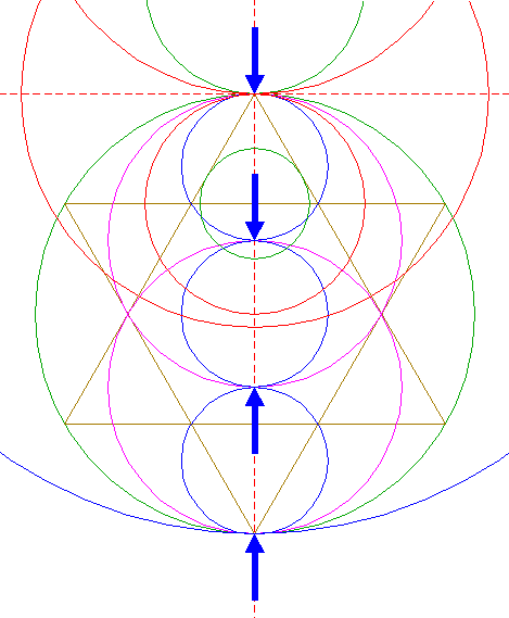 | Create a "Vesica Pisces"-pattern, by constructing two circles, both passing through the lefthand and righthand intersections of triangles 14, one passing through the top angular point, the other through the bottom angular point of these triangles, as shown. |