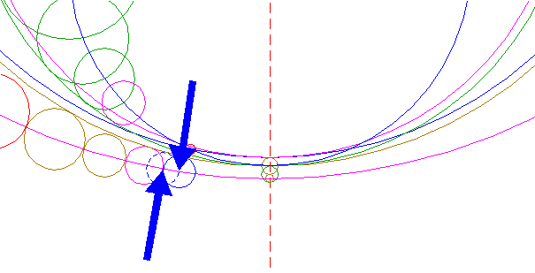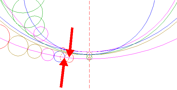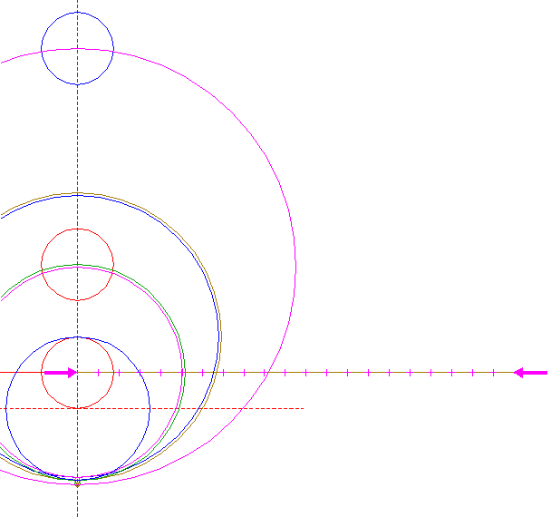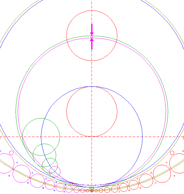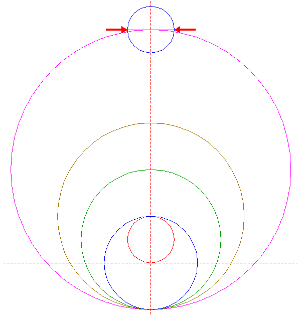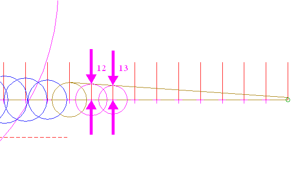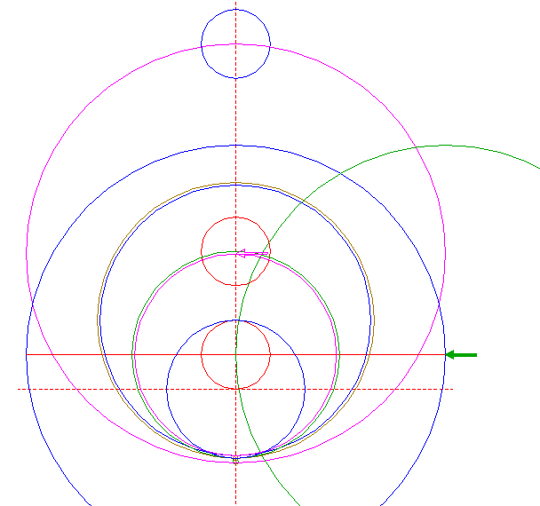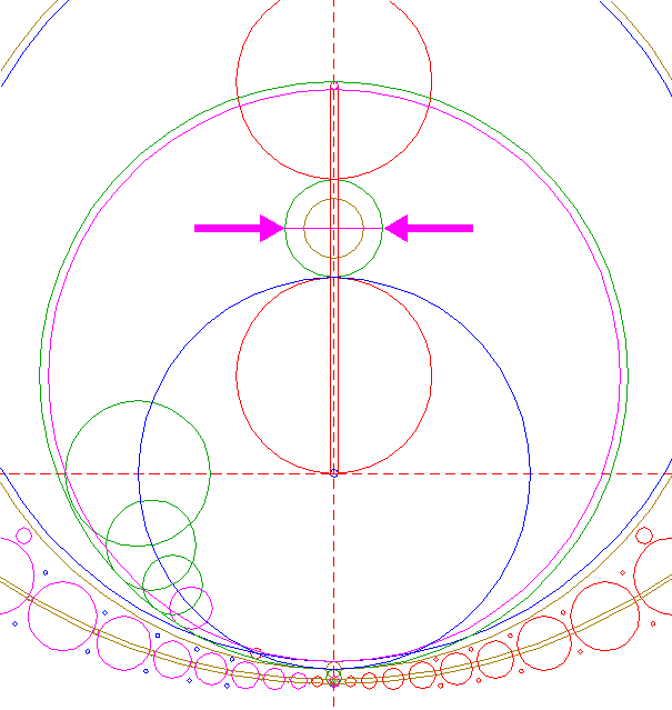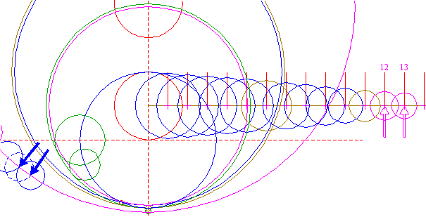 | Construct a "two-points" circle between the upper intersection of circle 1 and the lower intersection of circle 12, with the vertical centerline. | ||