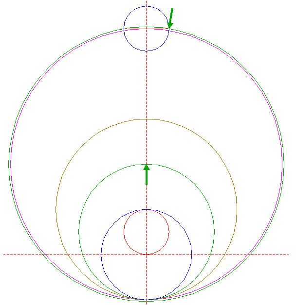 | Construct a "two-points" circle between the center of circle 13 and its lower intersection with the vertical centerline. | ||