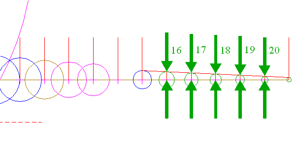 | Construct twenty-one lines, perpendicular to line 19, from division-marks 20 upto line 21. Number these lines (and the division-marks 20) from left to right 1 to 21. (These numbers will also be used to number circles to be constructed in following steps). | ||