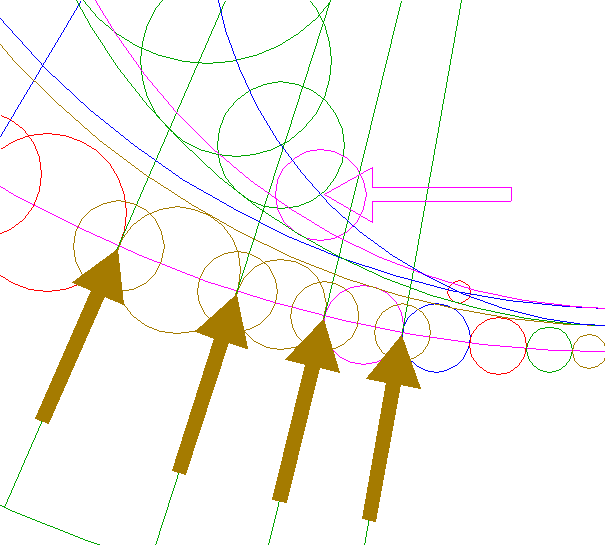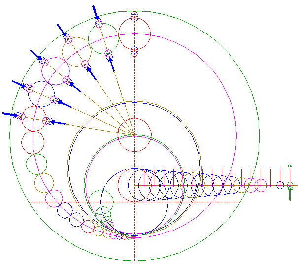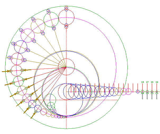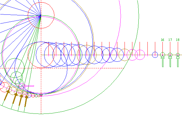 | Copy circle 53 nr. 16 to the righthand intersection of circles 15 and 54, and move this circle to its own corresponding intersection. See detail. | ||