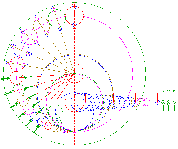 | Draw twelve rays of circle 15, from the center to the intersections of circles 28, 29, 30, 31, 32, 37, 38, 39, 40, 41 and 46, with circle 15, and extend these lines upto circle 63. | ||
