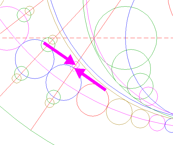 | Copy circle 53 nr. 20 to the upper righthand intersection of circle 46 and ray 67, and move this circle to its own corresponding intersection. See detail. | ||