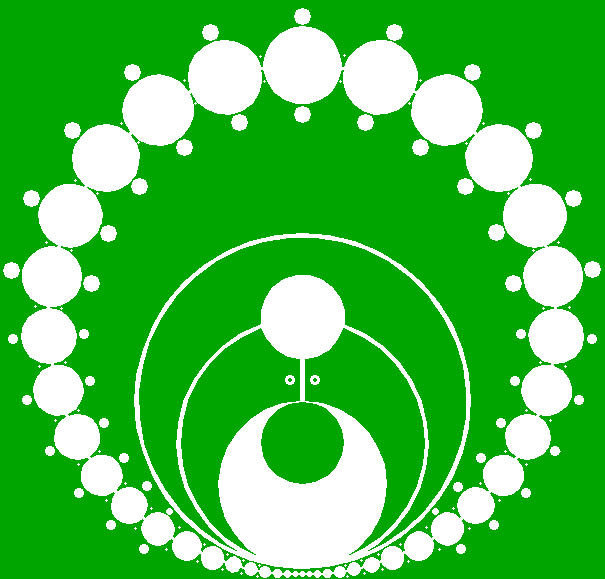 | Copy circle 75 thirty-two times, to the intersections of circles 72 and 74 with rays 71 and 73. | ||