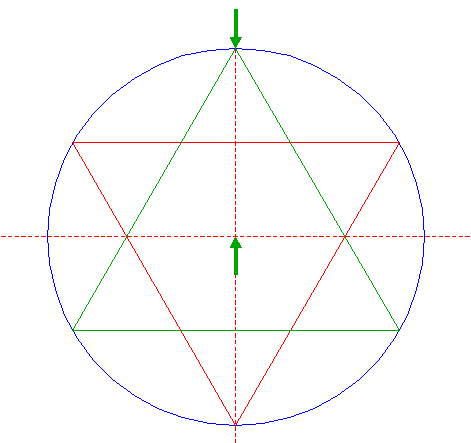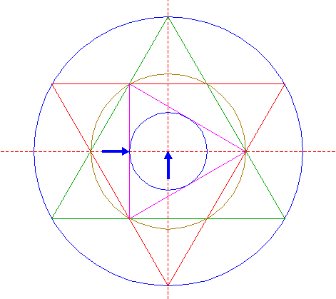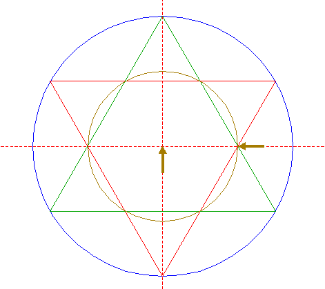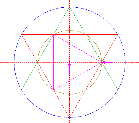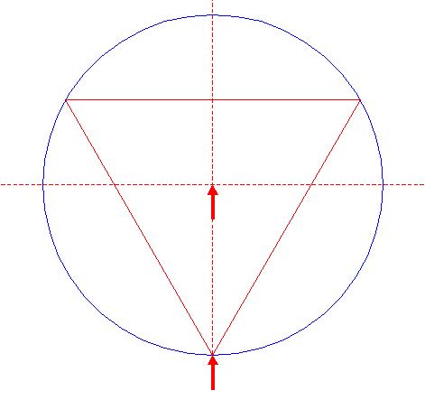 | Construct the inscribed equilateral triangle of circle 1, pointing up. |