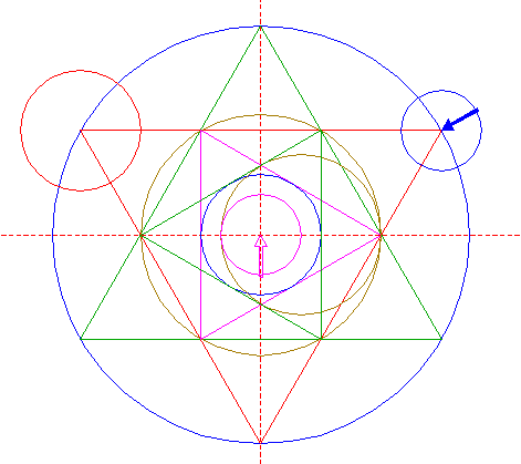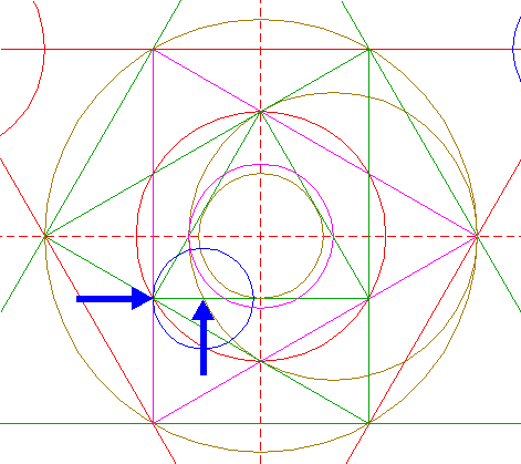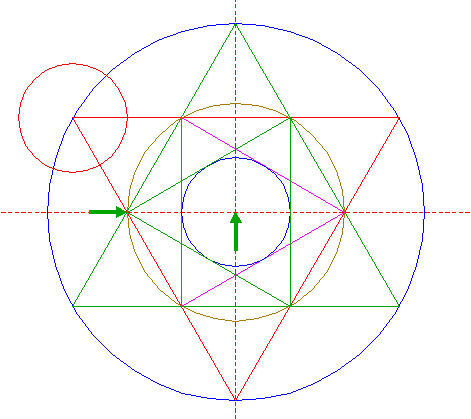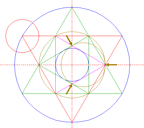 | Construct the circumscribed equilateral triangle of circle 25, pointing down. |