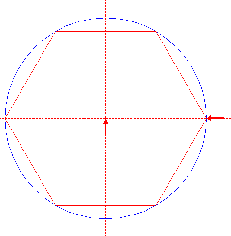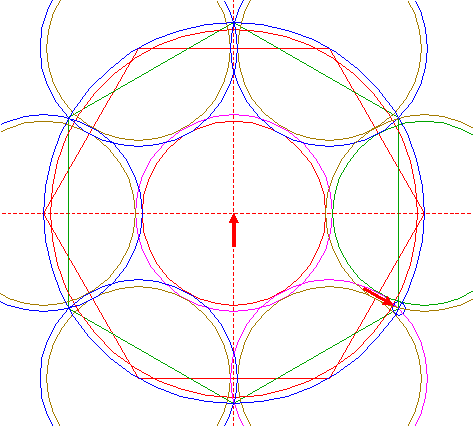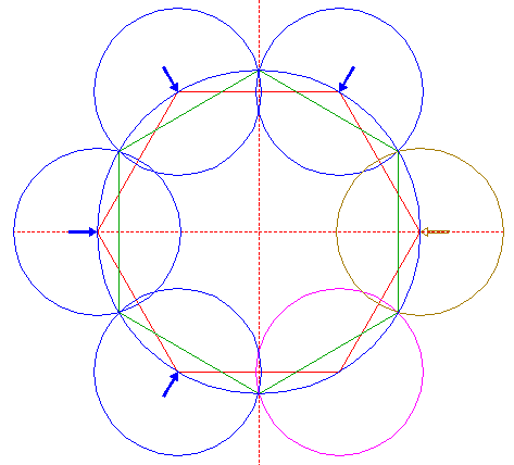 | Construct a circle centered at the rightmost angular point of hexagon 2, passing through the upper righthand angular point of hexagon 3. |