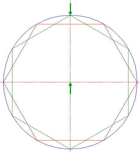 | Construct the inscribed hexagon of circle 1, pointing up. |