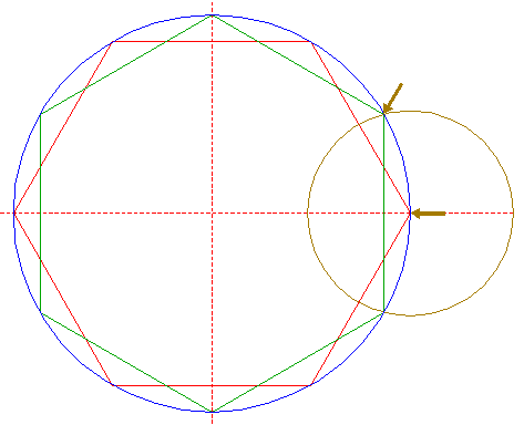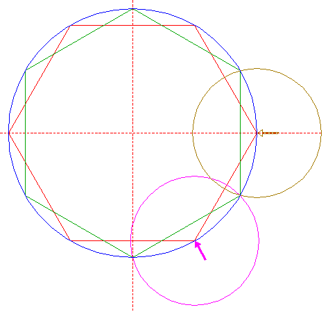| Construct the inscribed hexagon of circle 10, with one angular point at the center of circle 20. |