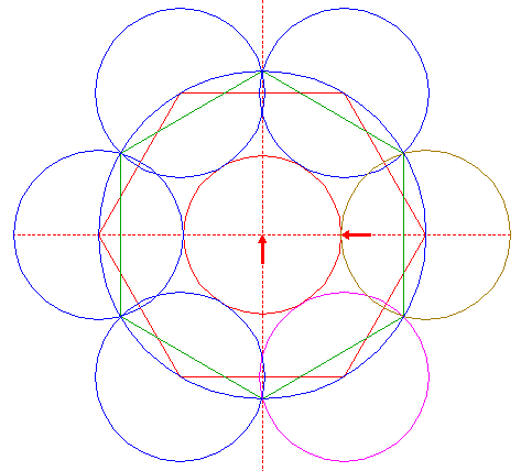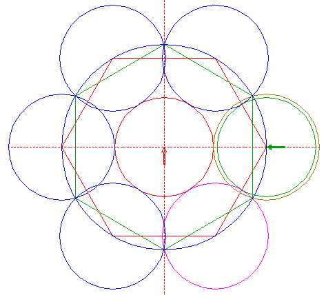 | Construct a circle centered at the intersection of the righthand side of hexagon 3 and the horizontal centerline, tangent to circle 1 at the righthand side. |