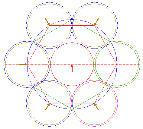 | Construct a circle centered at the lower righthand angular point of hexagon 3, tangent to circle 8 at the nearest side. |