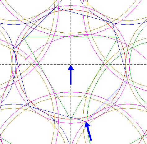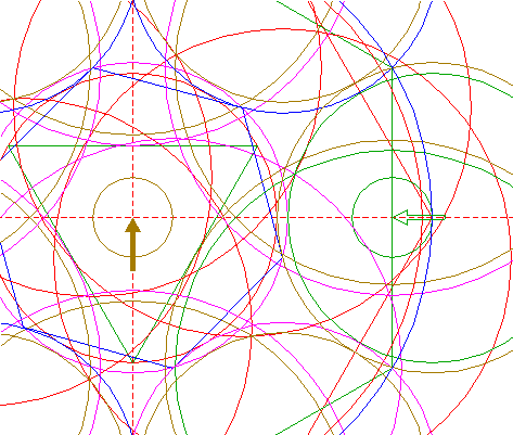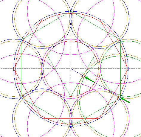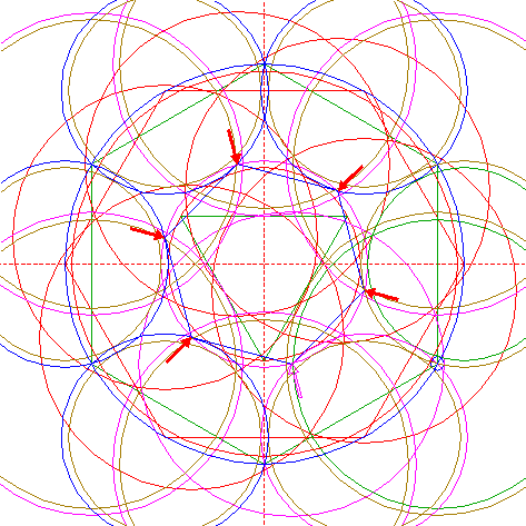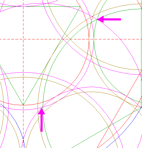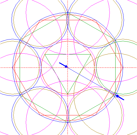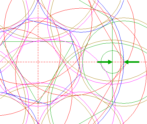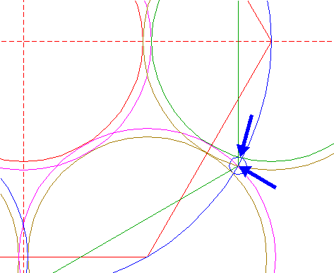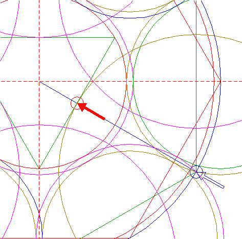 | Construct a circle centered at the lower lefthand intersection of circles 5 and 10, passing through the upper lefthand intersection of circles 8 and 18. See detail. |